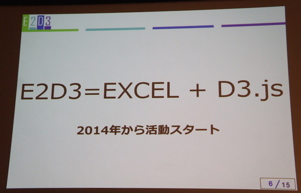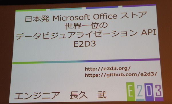 長久さんからは、日本発 Microsoft Office ストア 世界一位のデータビジュアライゼーション APIのE2D3を紹介いただきました。