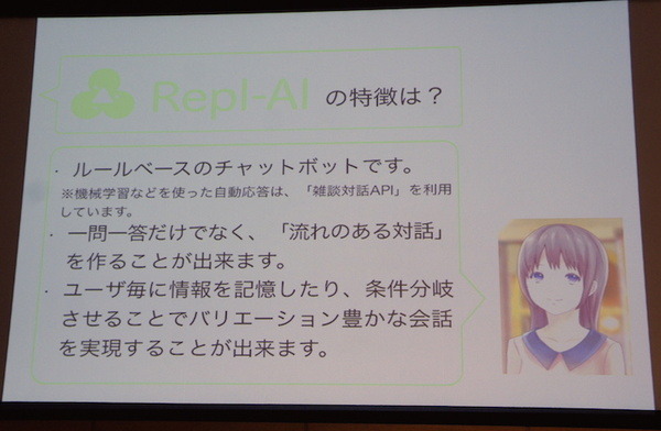NTTドコモの山崎さんからは、チャットボット作成プラットフォーム「Repl-AI」をご紹介頂きました。