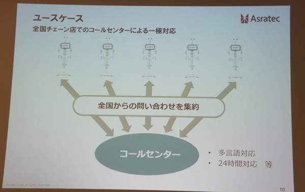 例えば全国チェーン店などのコールセンターで導入し、問い合わせを集約して利用するという活用法があります。
