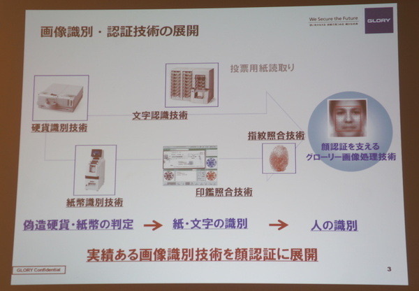 グローリーでは、偽造効果や偽造紙幣の判定のために「効果識別技術、紙幣識別技術」を開発、そこから「文字認識技術、印鑑照合技術」といった紙や文字の識別技術を開発。さらに指紋照合技術の開発もしており、これらの実績ある識別技術を「顔認証」に展開しています。