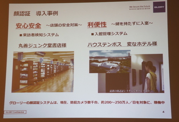 グローリーの顔認証は、丸善ジュンク堂書店での来訪者検知システムやハウステンボス変なホテルでの入館管理システムに導入されています。