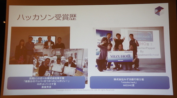 ハッカソンの受賞歴は「複数台のペッパーを使ったハッカソン!」と「mizuho.hack」で入賞。
