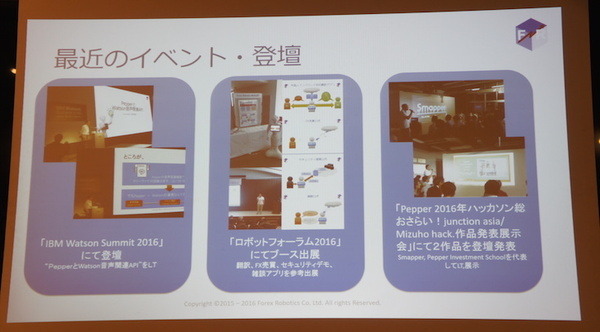 最近のイベント出展・登壇は、以下の通り。Pepper2016年ハッカソン総おさらい!」は、関連記事もご覧ください。