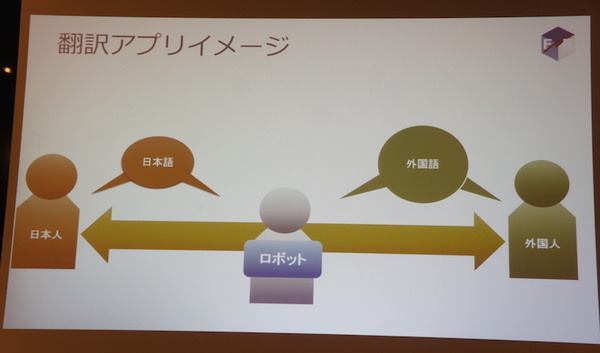 ここから翻訳アプリの紹介です。イメージは、日本人と外国人の間にロボットが立ちます。各々が母国語でロボットに話しかける形です。