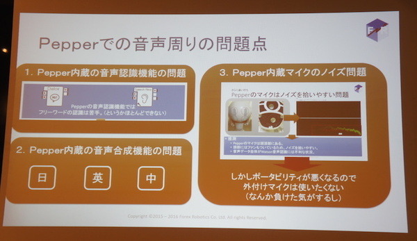 まず、Pepper内蔵の音声認識機能では、フリーワードの認識は苦手な問題があります。そして、Pepper内蔵の音声合成の問題があります。最後に、Pepper内蔵マイクのノイズ問題があります。