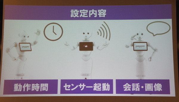 Pepperを動作させる時間、センサーの起動、会話・画像表示が設定できます。