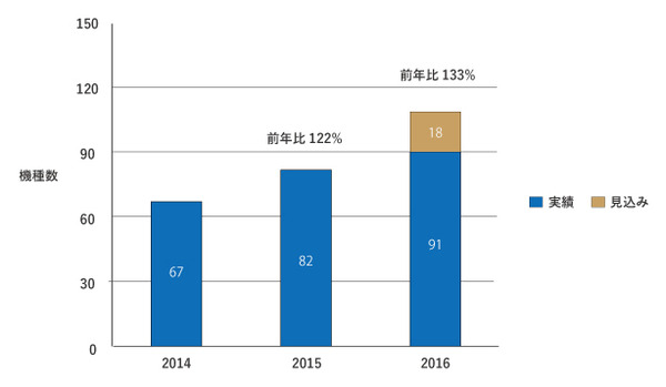2016年の新しいサービスロボットの機種数は昨年比で133%となり、調査を開始した2014年から引き続き高い成長を続けていることを示した。