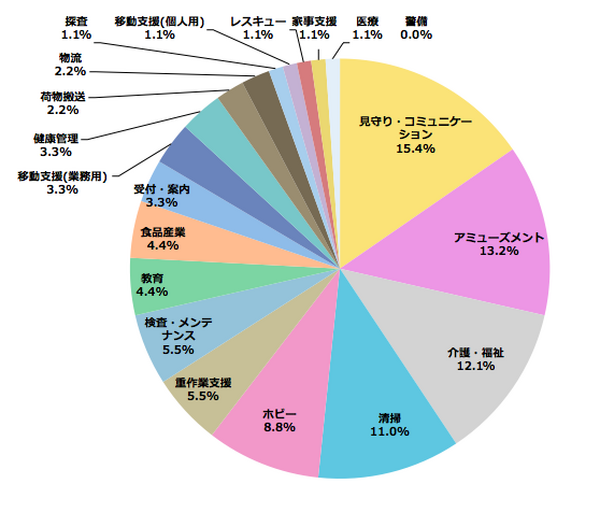 サービスロボットのジャンル別の割合では、「見守り・コミュニケーション」が最も多く、全体の約15.4%に及んでいる。2位以降、「アミューズメント」約13.2%、「介護・福祉」約12.1%、「清掃」約11.0%と続く。20ジャンルのうち上位4ジャンルで全体の半分以上を占める結果が明らかになった。