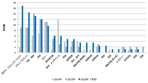 目立った伸びを示したのが「見守り・コミュニケーション」ロボットで、2014年に2機種、2015年に9機種だった新規開発数は、2016年ではおよそ17機種が見込まれている。これは前年比で約187%、2年前との比率は約840%となっており、「見守り・コミュニケーション」ロボットの躍進がデータのうえからも明らかだ。