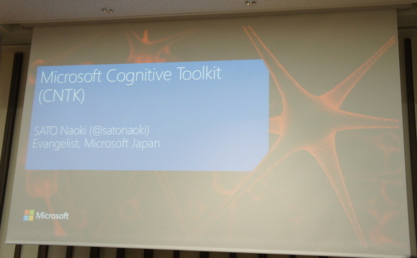 日本マイクロソフト株式会社 佐藤直生さんからは「Microsoft Cognitive Toolkitについて(旧:CNTKについて)」をお話いただきました。
