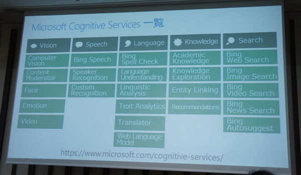 続いて、Microsoft Cognitive Serviceについてです。マイクロソフトのあらゆる分野のテクノロジー開発から誕生したWeb API経由で利用できる”人工知能パーツ”です。人間の認知機能の一部をコンピュータ演算モデル化したものです。