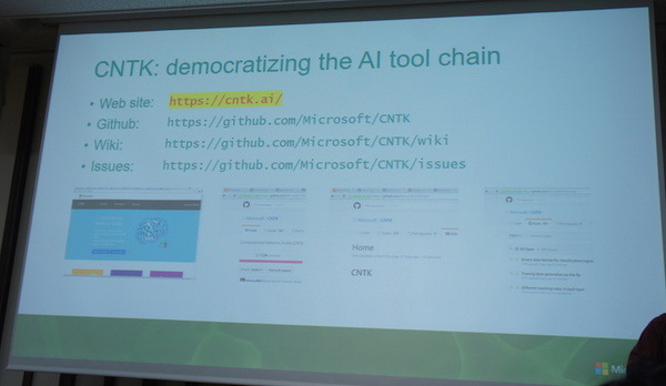 Microsoft Cognitive Toolkit (CNTK) についてです。こちらはオープンソースのディープラーニングキッドで、GoogleのTensorFlowと同じカテゴリに入るライブラリーです。