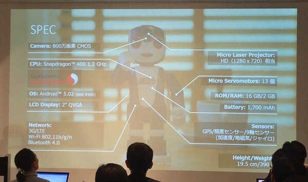 一般的なスマホと異なるのは、内蔵されている13個のサーボモータで手足などが動いたり、頭のレーザープロジェクタで投影ができる点です。