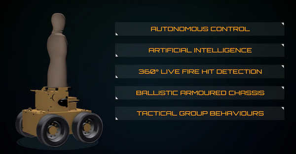 自律制御、人工知能搭載、全方位からの狙撃検出、被弾に強い防弾シャシー、集団行動などに対応しているという。