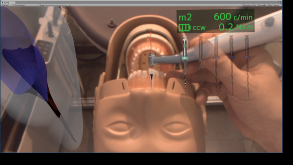 歯の神経を除去し、詰め物をするために、歯の根管を拡大する作業。 神経を除去している領域の3DCGを、実際の治療歯の上に重畳表示させて、施術者を支援