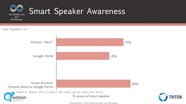 消費者向けのメディア・テクノロジーの最新レポート「2017 Infinite Dial」によれば、既にAmazon EchoやGoogle Homeなどのスマートスピーカーは、現在アメリカ人の63%が認識しており、およそ7%は少なくとも1台のスマートスピーカーを所有しているという。