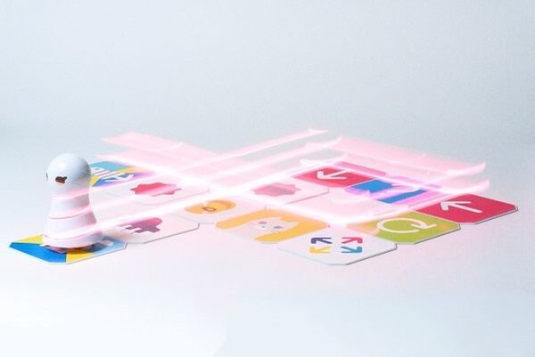 自走型ロボットが移動しながらパネルのコマンドを読み取り、コマンド情報(発光・動作・音声など)を順次実行
