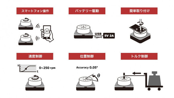 スマートフォンやタブレットで操作することができ、ロボットカーの車輪のモーターとして活用したり、カメラの三脚やスタンド雲台部分に取り付けて制御するなど、利用方法はさまざまだ。