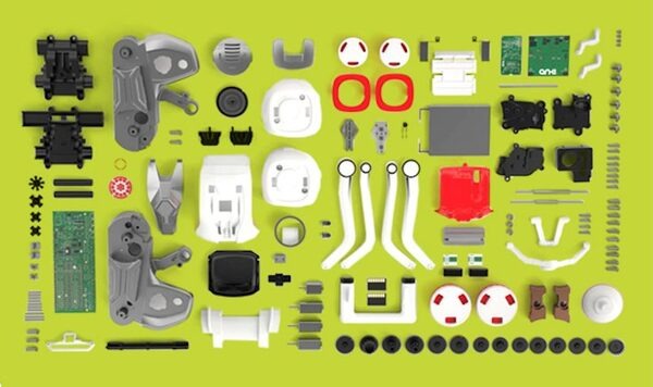 中にあったものをすべて取り出してみました。COZMO本体、パワーキューブ3つ、ACアダプター&充電ドック、スタートマニュアル類などが入っていました。