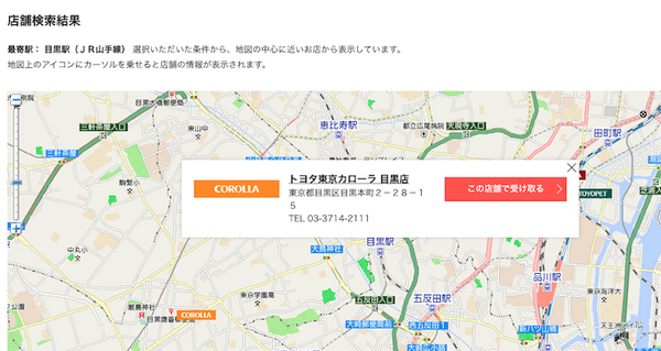 住所から検索できるのですぐに近くの見せを選べます。ロボットスタートから近そうなトヨタ東京カローラ目黒店を選びました。