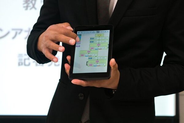 タブレット上でビジュアルプログラミングをしながら、技術を学んでいくことができる