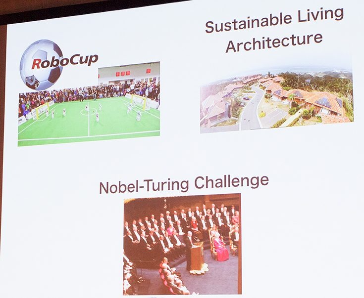 北野氏はロボットによるサッカー競技等の国際大会「ロボカップ」の発起人であり、「サステイナブル・リビング・アーキテクチュア」と「ノーベル・チューリング・チャレンジ」を含めた3つのチャレンジを掲げています。