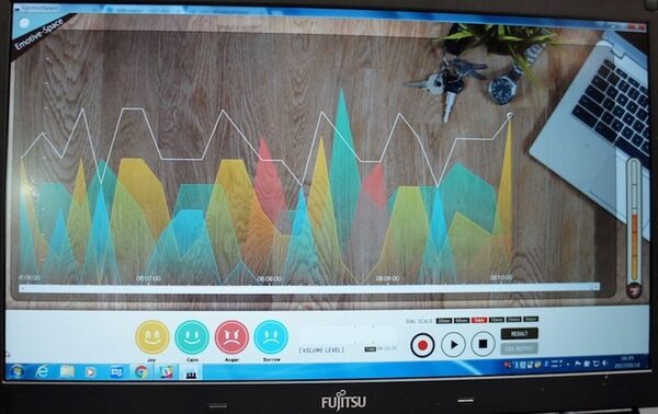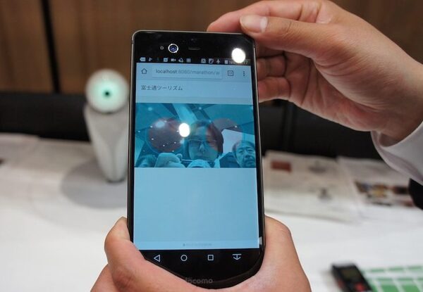 「富士通ロボットクラウドプラットフォーム(仮称)」の展示がされていました。ロボットから人間の顔画像や声を取得し、顔表情認識や音声感情認識の分析結果データを統合管理するというものです。