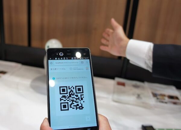 まずはスマートフォンでログインを行います。今回のデモでは、人間の目を使った虹彩認証でログインをしてみます。無事ログイン出来るとQRコードが表示されますので、こちらをロボピンにかざします。