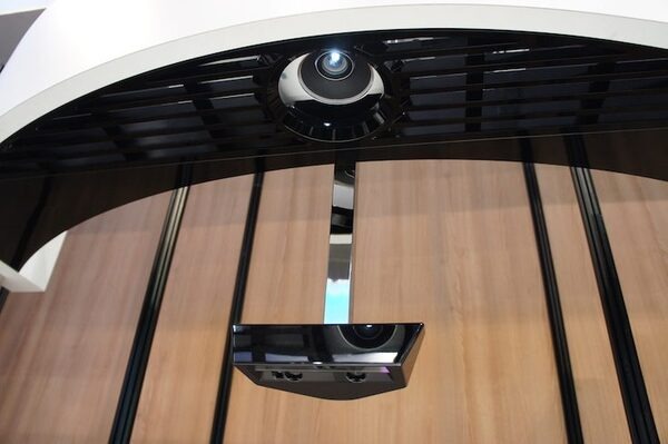 どうしてテーブルに文字が投影されてその文字を押すと反応するかというと、ロボピンとともにプロジェクター、カメラ、センサもセッティングされており、これらが連携しているからです。