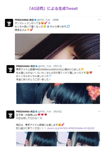 2016年11月に公開された中部経済新聞『AI記者』のエンジンをベースに設計された、同プロジェクト用の『AI記者』に、若手アイドルグループ『PREDIANNA(プレディアナ)』侑杏(ゆあ) さんのTweetデータを学習データとして提供。新たに開発した個人のツイートからクセや特徴を学習させることで「らしい文章」を生成する。
