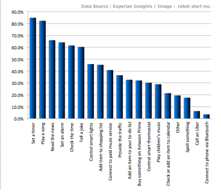 以下のグラフは、2016年5月に発表された「Experian Insights」による「Amazon Echoで一度でも使ったことがあるスキル」の調査結果だ。