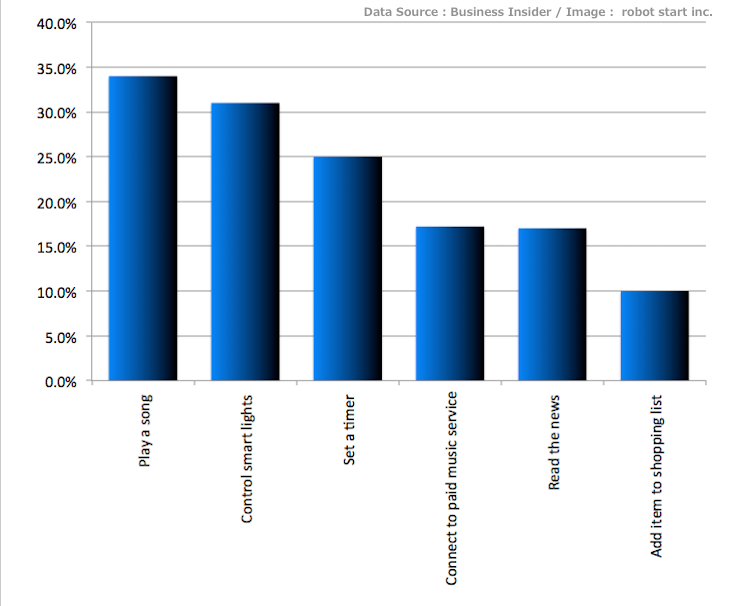 利用者に用途を尋ねた2017年最新のデータだ。一つ前のデータと比べると若干用途に変化があることがわかる。「一般的な質問」、「天気」、「音楽再生」、「タイマー・アラームセット」、「リマインダー」、「カレンダー」、「スマートホームデバイス制御」、「ニュース再生」と続いている。2016年に頻繁に利用されていた「タイマー」や「音楽再生」以外の使われ方も日常的になってきたことがわかる。また、10%前後のユーザーはスマートスピーカー経由で製品・食品・サービスの注文をしていることもわかった。