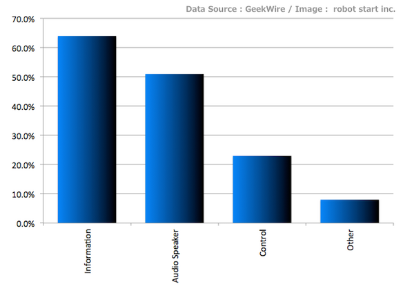 用途を質問した結果、「情報取得」、「音楽再生」が50%を越す結果となった。次いで「ホームデバイス制御」、その他と続く。