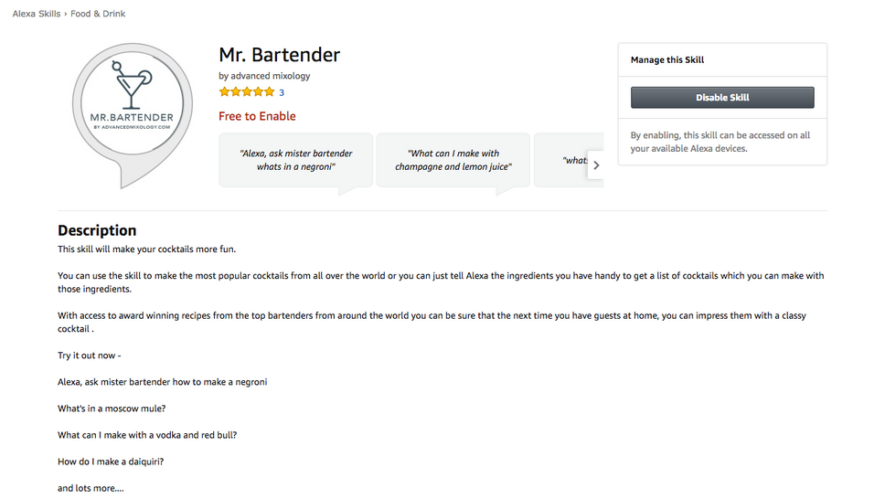 このスキルの特徴は、「カクテルを伝えると名前から作り方を教えてくれる」「お酒と飲み物を伝えるとそれが含まれているカクテルを教えてくれる」という両面での検索が出来ます。