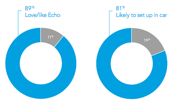 これを裏付けるように、現在のEcho所有者の89%がEchoを愛しているまたは好きと答えている。また、車内で使えるなら使いたいと回答した人も81%という高い水準となっている。買った人の満足度が高いことが伺える。