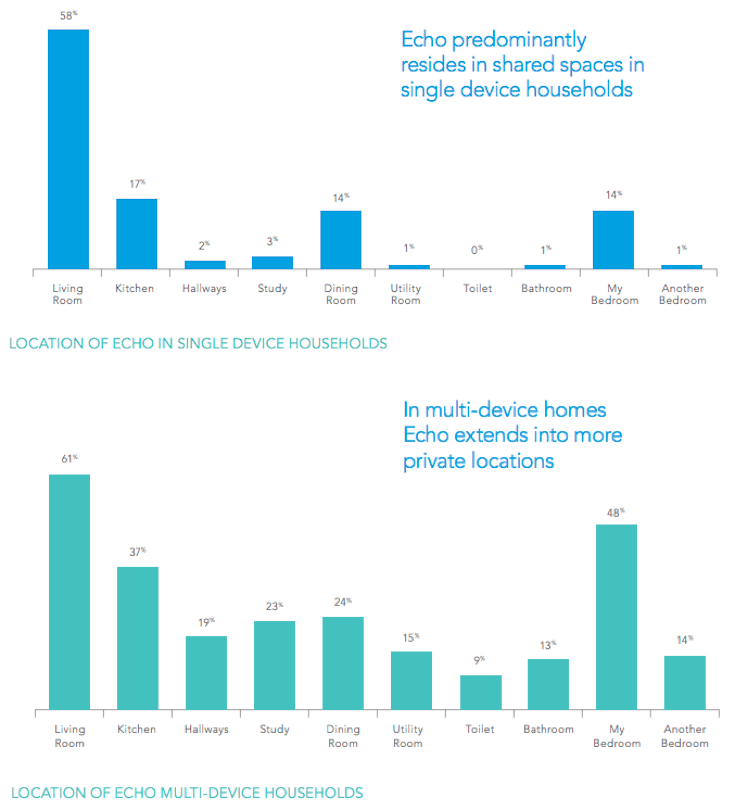 Echoを1台のみ所有している家庭では、リビングに設置、ついでキッチン、ダイニングルーム、ベッドルームと続く。一方、複数のEchoを所有している家庭では、リビング、ベッドルーム、そしてあらゆる場所での設置に広がっているのがわかる。複数台置くのであれば、トイレやお風呂も設置場所になるのがグラフからも読み取れる。