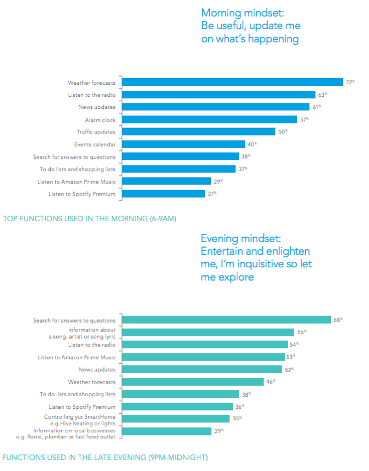 朝は天気・ラジオ・ニュース、夜は質問、音楽、ラジオが上位の使われ方となっている。朝はその日に役立つ情報を収集し、夜はエンターテインメントよりの使われ方となっていることがわかる。一方、ラジオコンテンツ(フラッシュブリーフィングスキル)は時間を問わず人気だ。
