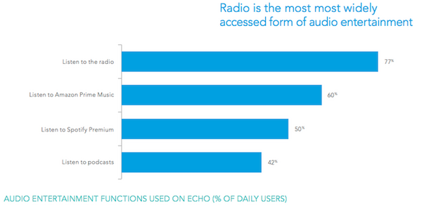 実際にEchoの利用時間の72%がラジオを聞くのに使われているという結果となっている。Radioplayer、TuneInといったスキルが人気という。