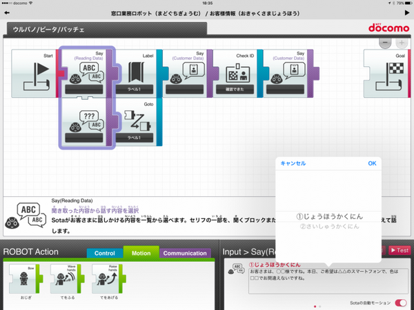 プログラムを作るためのタブレットは、wifiでSotaにつながっています。Sotaはインターネットにつながっていて、ドコモの自然対話エンジンとアクセスしています。
