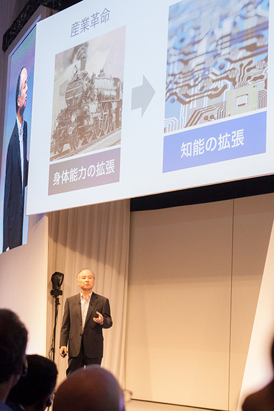 登壇した孫正義氏は、産業革命を主導した投資家「ジェントリ」になぞらえ、ソフトバンクがリスクをとった投資により情報革命を牽引していくということをまず語った。