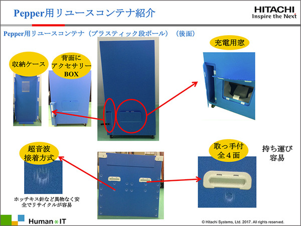 その業務遂行のためにPepper専用の輸送箱も開発しました。配送時に雨や衝撃などによる破損を防ぐ工夫が施され、4面に持ち運びしやすい取っ手、一人で持ち運べるキャスターストッパー、Pepperを出し入れしやすいスロープまで装備されています。更に輸送箱に収納したままでPepperに充電できるすぐれもの、「日本パッケージングコンテスト2016 大型・重量輸送部門賞」に入賞した実績があります。