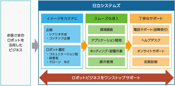すなわち日立システムズは、導入前の相談、業務に合わせたロボアプリの開発、Pepperの導入と設定、保守メンテナンス(交換)までを「ワンストップで提供」しています。