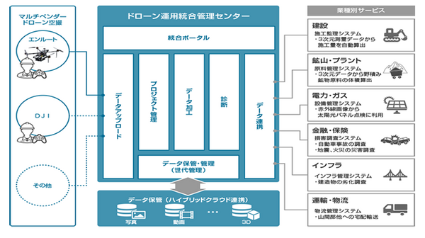 はい、ドローン運用統合管理サービスです。ドローンの場合は、実際の業務ですぐに利用して頂くための「SI」(システム・インテグレーション)サービスに近いと思います。今はエンルート社とDJI社のドローンに対応していますが、当社が所有しているドローンを使って空撮したり、撮影した映像を見やすく加工して納品する業務が多くなっています。