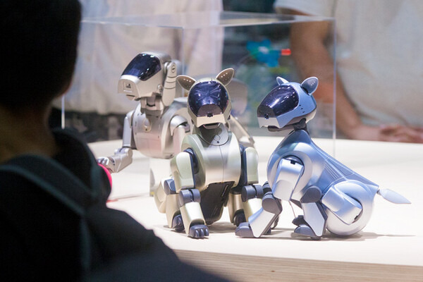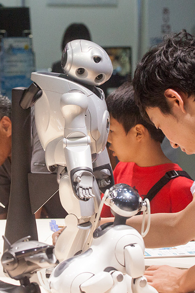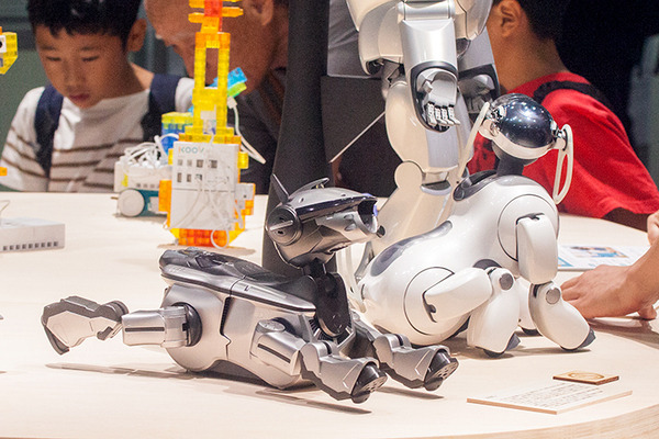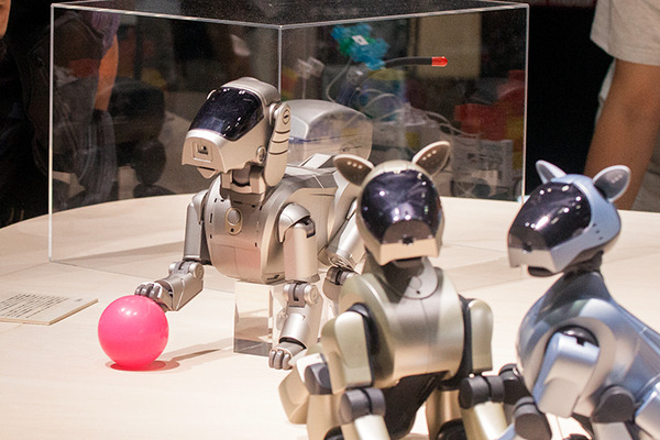 最初の報告でアレですが、ロボカップサッカー競技場が集まる展示会場の手前にはメーカーさんの展示ブースがあるんです。そこにはなんと、な、なんと、懐かしのソニーのロボット犬「aibo」(アイボ)の皆さんが展示されているんです。更に更に、aibo後期に開発されていた二足歩行型ロボット「QRIO」(キュリオ)までもがいるんです(^o^)。