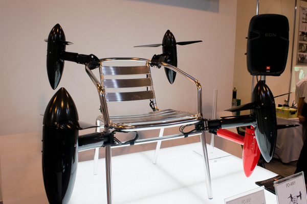 そして驚いたのが、こちらの展示。椅子に4つのプロペラが後付けされており、この椅子をそのまま飛ばすことができるようになるというドローンです。