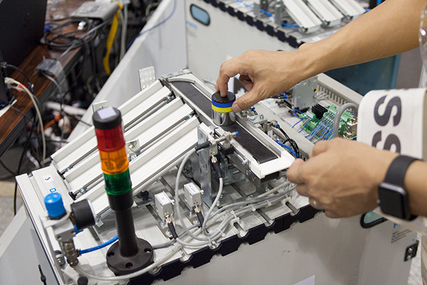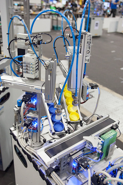 四角いボックス型の機械はメカトロニクス装置「MPS」(modular production system)ステーションと呼ばれ、それぞれが製造機械をイメージしたものだ。部品を供給したり、部品を組み上げたり、ベルトコンベアーの用途など、各MPSがそれぞれ様々な役目を持っている(MPSはFesto Didactic社の開発)。