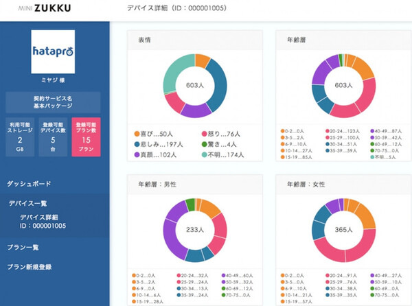 来店者が「ZUKKU」の目の前に立つ、ないしは「ZUKKU」を手に取ると、搭載されたカメラで自動で来店者の属性(年齢や性別など)を認証、集計を行う。この属性情報をもとに、連動したサイネージ上に、その人に最適な商品情報を表示。今回はレストランフロアに「ZUKKU」を設置し、属性情報をもとに最適なレストランメニューの提案を行う。
