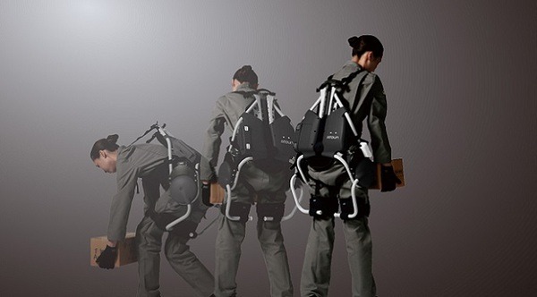 今回の実証実験では、運送会社や配送センター、工場など、重い荷物の上げ下げを頻繁に行う作業現場に導入されているパワーアシストスーツ「ATOUN MODEL A」にパワーリフティング用の装飾を施して使用した。
