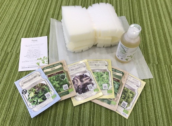 こちらはサンプルで付いてきた種・スポンジ・液体肥料のセット。