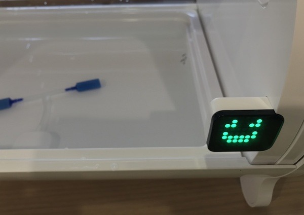 ハードウェアは、センサー(照度、水位、温度湿度、CO2、ドアセンサー)、太陽光に近い光のLED、自動制御のファン、エアーポンプ、表情アイコン表示を搭載。